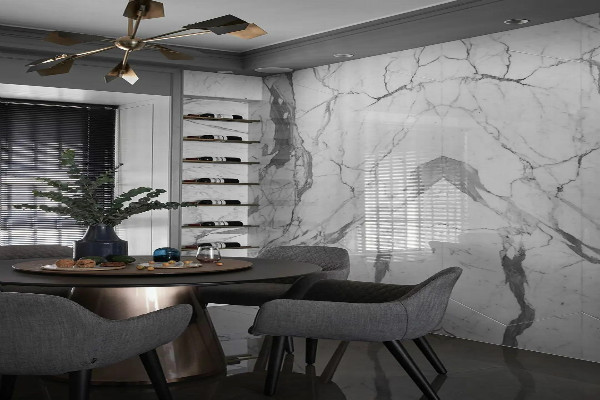 餐厅的布置与客厅节奏统一主灯饰,在角落里做了一个到顶的酒架展示区,体现了蒙自万达御府屋主人高雅的品味格调。选择一面纹路对称的白色岩板,提升视觉感受,让房间不会太压抑,中间摆上一张转盘的餐桌,深蓝色的瓶身,肥叶的插花,配上精美的餐具,布艺的细脚餐椅,营造了一个仪式感满满的用餐空间。