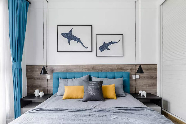 卧室空间同样没有安装主灯,空间中加入了代表忠诚和希望的蓝色,为蒙自紫金学苑卧室空间营造了一个温柔、宁静的休息睡眠氛围。床头墙做了木饰面,与地板衔接,挂上两幅高低错落的鲸鱼简画,为空间增添了几分文艺气息,布艺的大床,铺上灰色的床铺,加以黄色抱枕、台灯贯穿,将空间融为一体。对称设计的床头柜和吊灯,让房间富有层次感,显得不杂乱,床尾布置了一个简易的工作区,平时可用作办公阅读,无形中也增加了卧室的储纳空间。