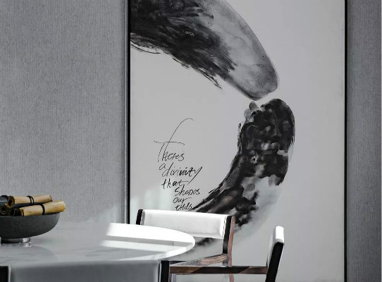 餐厅做了一个圆形的吊顶,安装上一个不闭合组圆形吊灯,一幅水墨抽象画上加上英文,蒙自锦隆财富中心餐厅上方设计简灯照射在画上,形成了独特的艺术美感,餐厅墙面做灰色硬包处理,明朗有致的线条简洁理性。一套有创新性的黑白餐桌,弯曲弧度流畅优美,与墙上的装饰画呼应,黑白的配色经典不会过时,桌上放置上收纳餐垫盘、果盘和高脚杯,一瓶翠绿繁茂的花瓶装饰,营造了一个优雅端庄的用餐空间。
